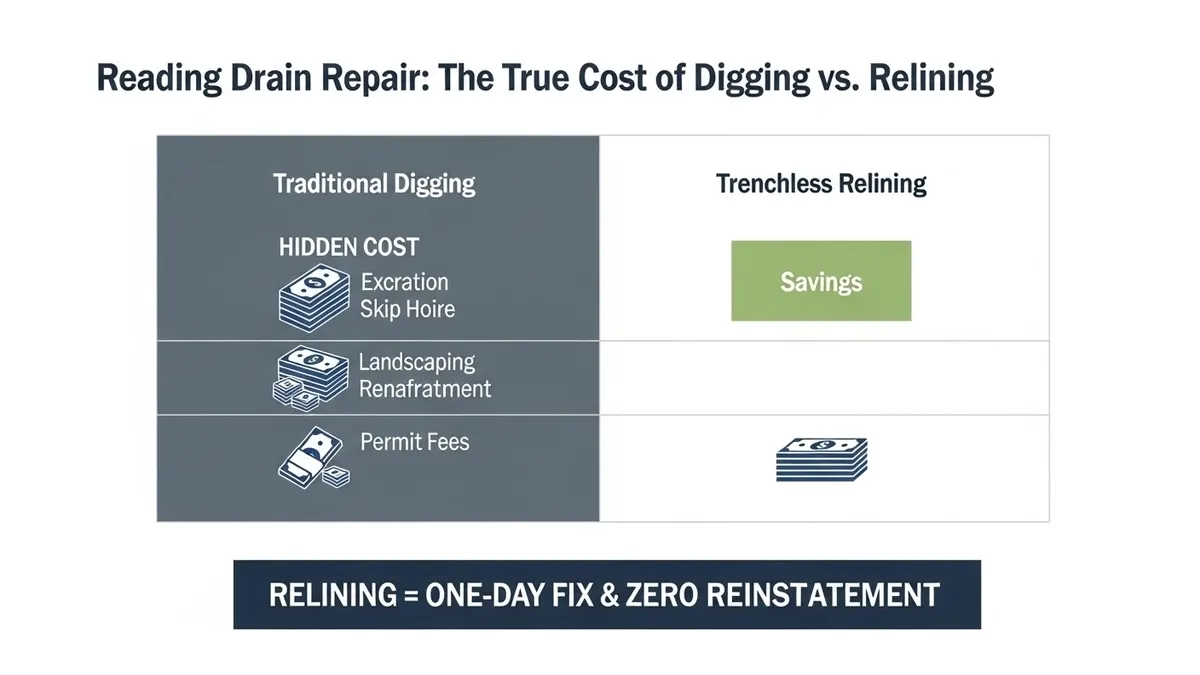 If you wait until the pipe collapses, the cost jumps from a standard £600–£1,200 relining job to a full-scale excavation that can easily exceed £3,000-£5,000, especially if we have to navigate utility lines or reinstate expensive landscaping near Oxford.