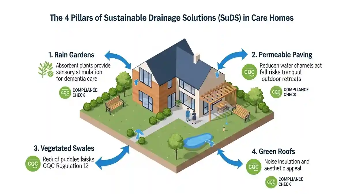 The future of sustainable drainage solutions CQC care home design is the integration of SuDS (Sustainable Drainage Systems). In Oxford, Policy EN18 of the Local Plan encourages SuDS to manage surface water runoff, which often plagues the surrounding area.
